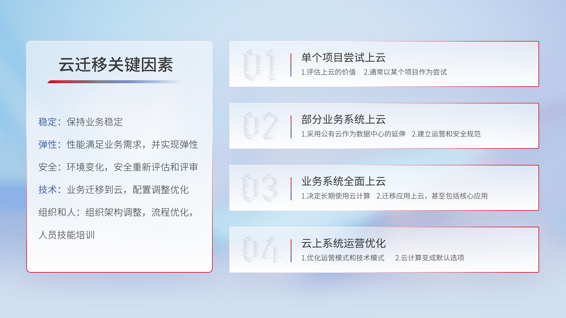结合实际业务,,,,从规划设计、、云平台选型、、云原生改造、、、、数据迁移、、、、集成交付,,,迁移全过程为客户识别最佳上云路径,,做好风险识别管理,,,,设计网络架构、、身份权限、、、、安全审计合规、、操作审计、、、、日志审计、、监控告警策略、、、多站点容灾设计等,,,对云上基础设施进行整体规划,,提升IT治理水平,,以满足弹性、、、高可用、、高性能的需求。。