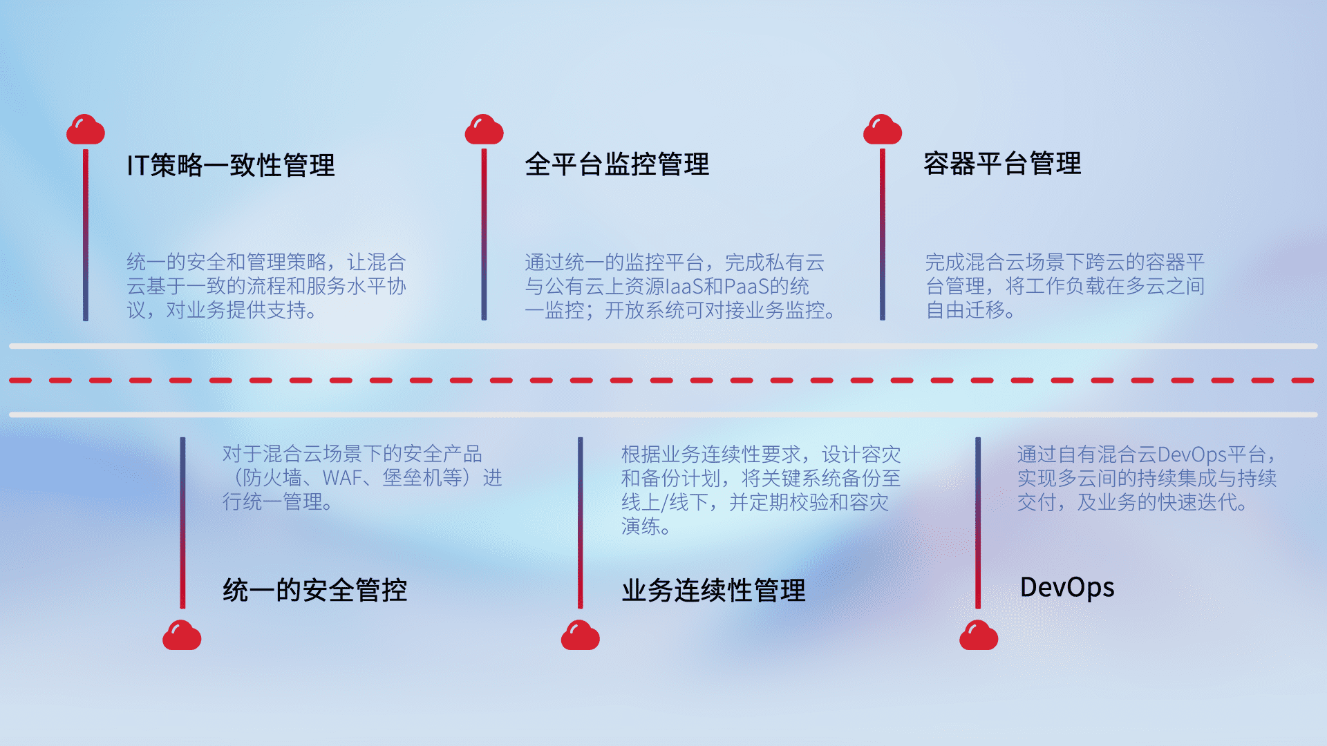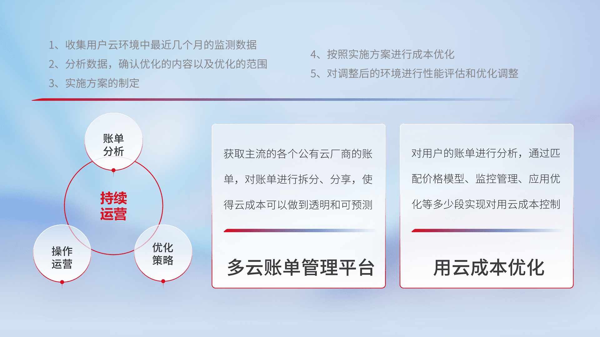 通过多云纳管,,,,以统一的资源数据模型把客户的云资源进行抽象和封装,,进而实现对多云资源的统一操作,,保障云资源管理的可靠性、、、、稳定性与可用性。。。量身定制化运维内容,,,,配置、、、、开发运维、、、补丁管理、、、、备份、、、、监控、、认证和访问管理、、、审计和日常巡检等,,,,保障在用云过程中的可靠度,,,稳定度以及高可用率。。。。