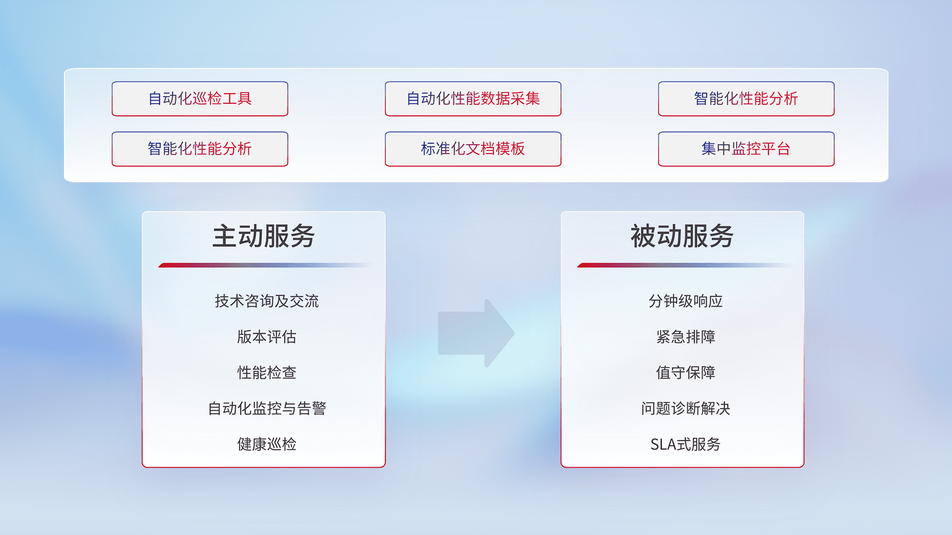 智能化工具和标准化文档,,保障服务质量,,,提供主动服务(包含技术咨询、、版本评估、、、、性能检查、、、自动化监控与告警、、健康巡检)和被动服务包含(分钟级响应、、紧急排障、、值守保障、、、、问题诊断解决、、、、SLA服务)。。。